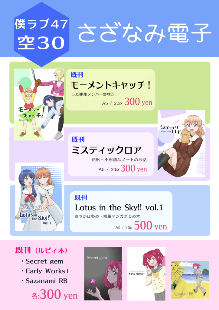 サークル「さざなみ電子」では、2024年9月21日に開催されます「僕らのラブライブ!47」 にサークル参加いたしますので、お知らせいたします。